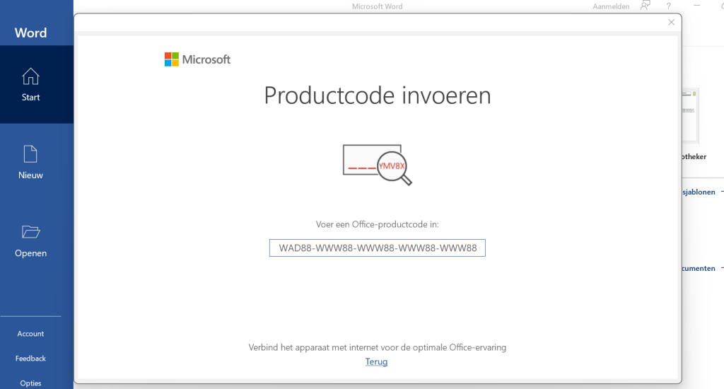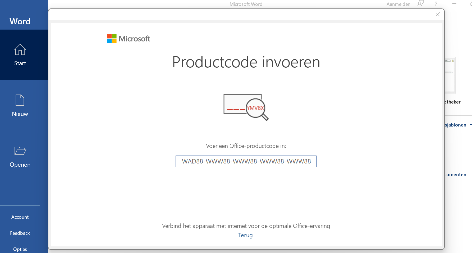 U ziet nu een melding “Productcode invoeren” Ziet u deze melding niet, open dan Word, klik op bestand en ga naar account. Bij productgegevens heeft u de optie om het product te activeren.