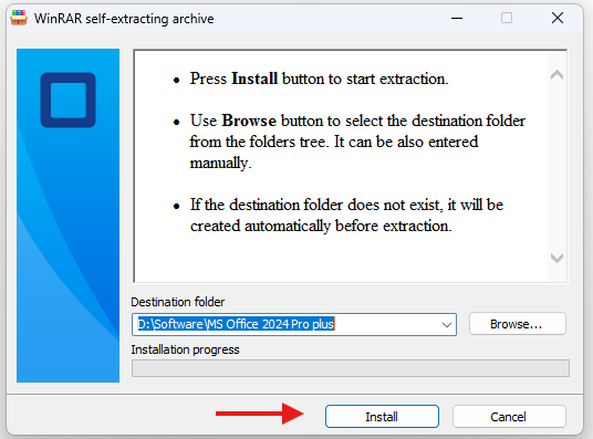 Na het downloaden open het Office_2024_EN_64Bits.exe bestand en click op install om de installatie te starten.