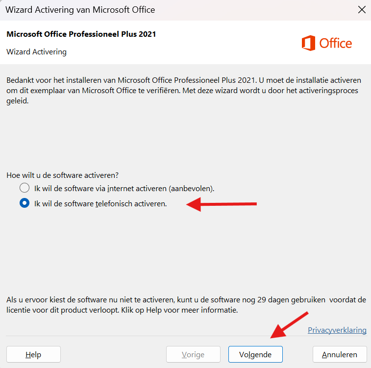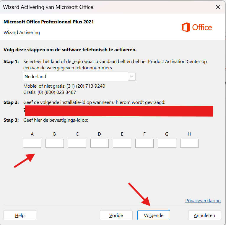 Vul de cijferreeks in die u ontvangt van Microsoft bij stap 3 Deze moet 100% goed zijn, anders kunt u de software niet activeren.